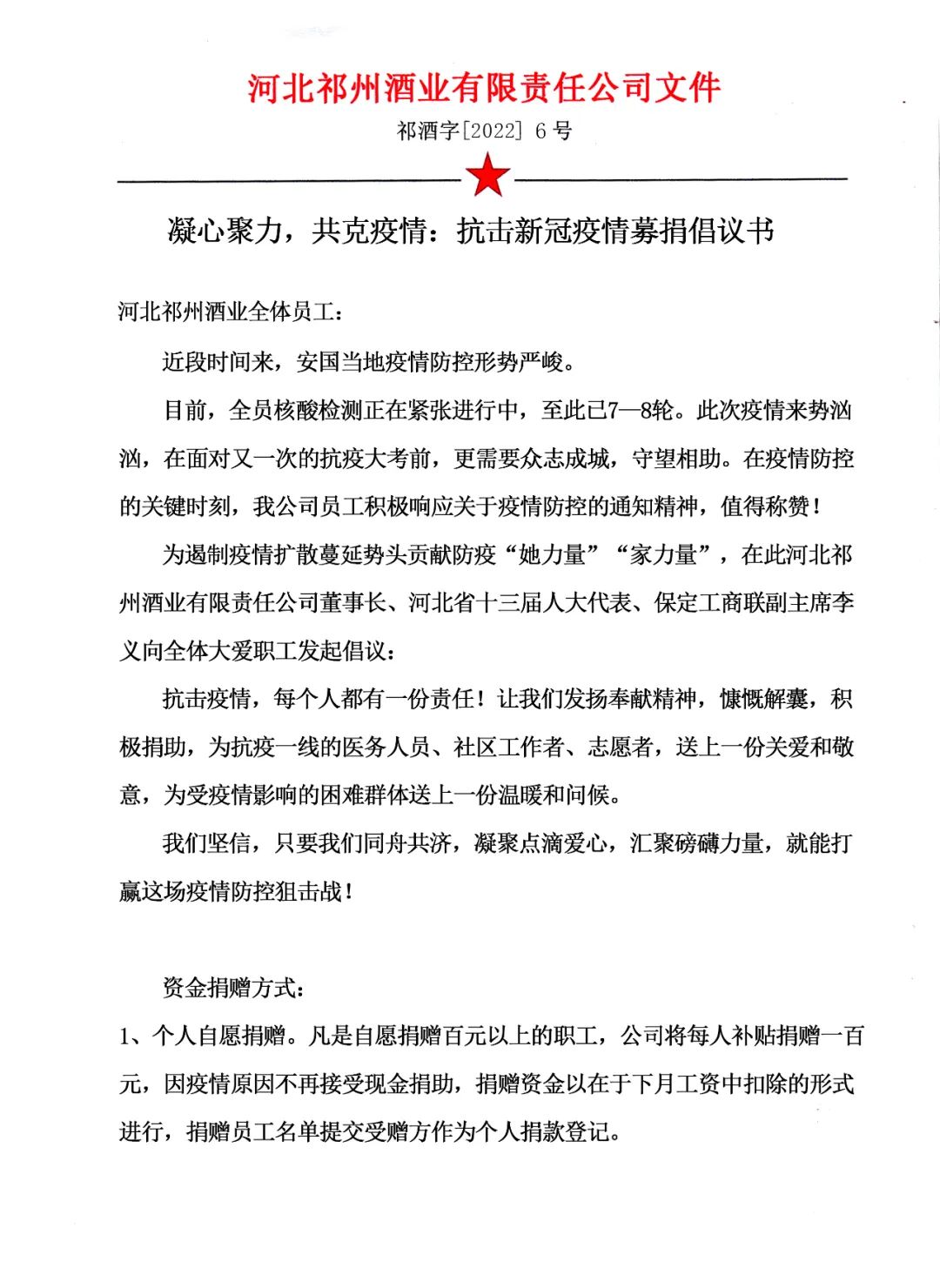同時,祁州酒業員工在積極落實各項政府防疫要求,做好企業自身疫情防控工作的同時,紛紛主動要求要為家鄉抗疫做點實事,自發以班組、部門為單位開展義務捐款活動,截至目前員工踴躍捐款正在持續進行,捐款數額不斷追加,后續統計完畢將統一進行捐贈。